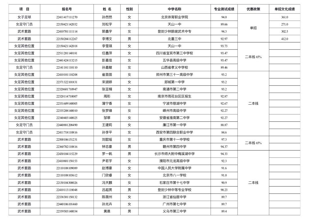 根据《yl7703永利集团2022年高水平运动队招生简章》,经我校招生工作领导小组研究决定,现将我校2022年高水平运动队入选资格考生名单公示如下(还需经阳光高考平台公示无异议后资格方可有效)。优惠政策为文化课单考的考生参加国家体育总局组织的文化课统考合格分数线为271分。