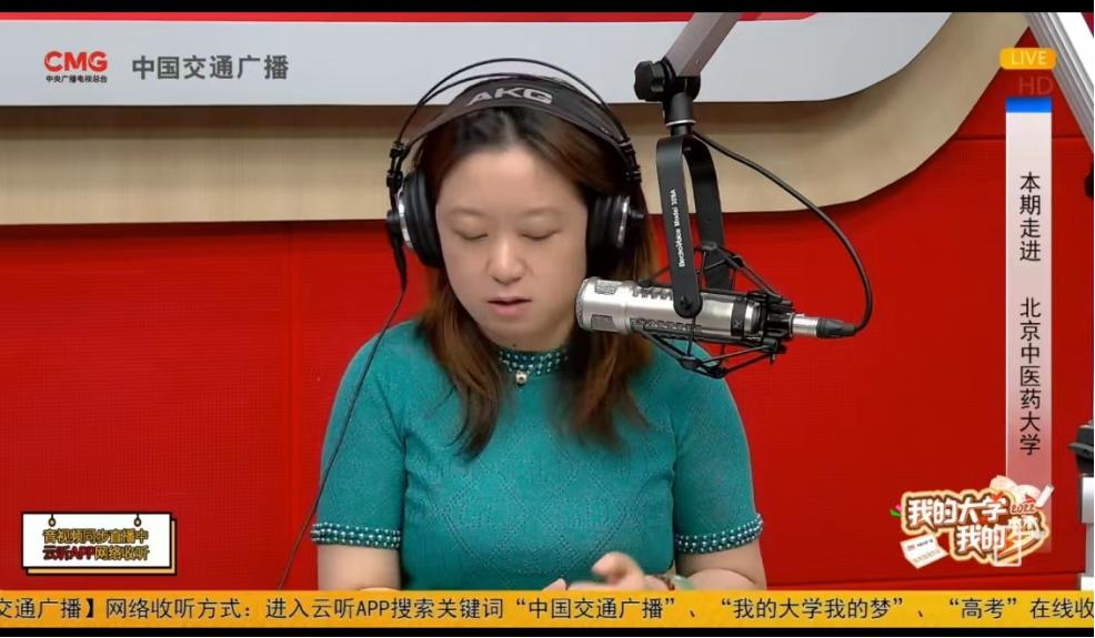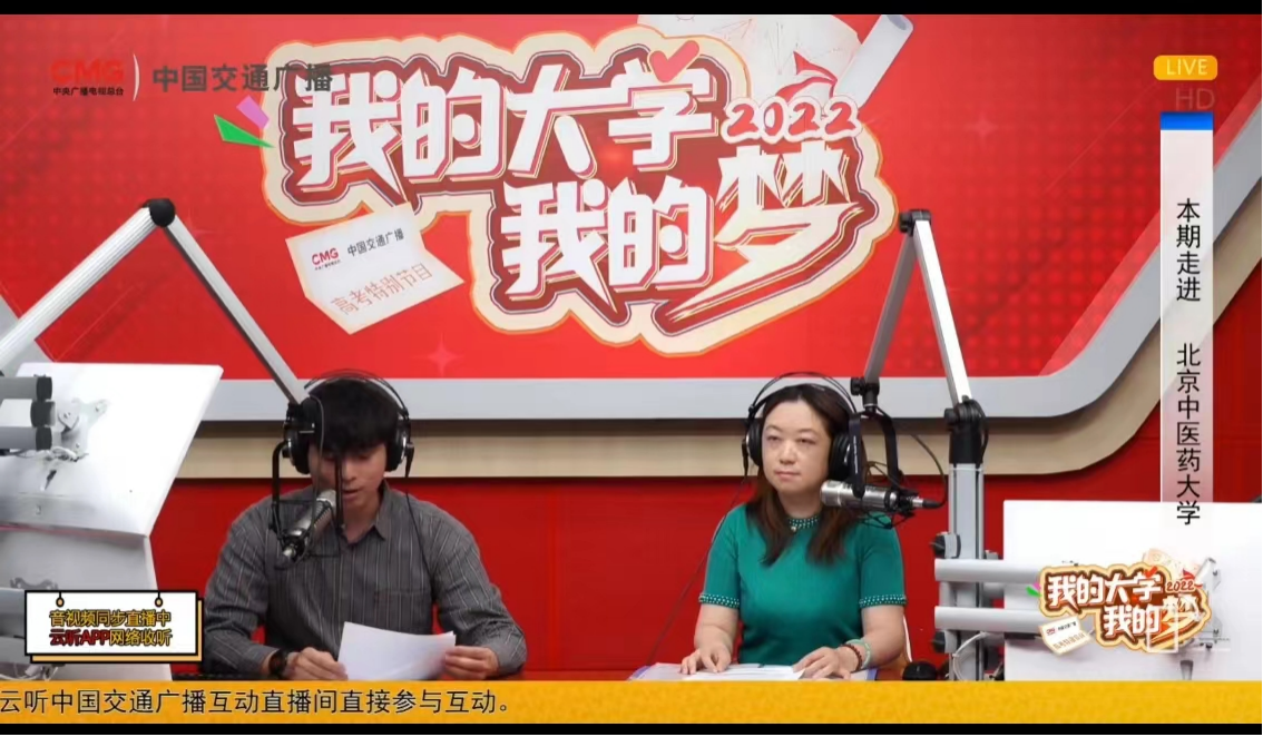 2022年5月30日,我校招生与就业处副处长徐静老师做客中国交通广播《我的大学我的梦特别节目》,为考生和家长解读最新的报考资讯,探讨中医药行业的发展动向,未来前景,提出中医药在新时代有绝对的发展优势。超五万余观众进行了观看并互动。