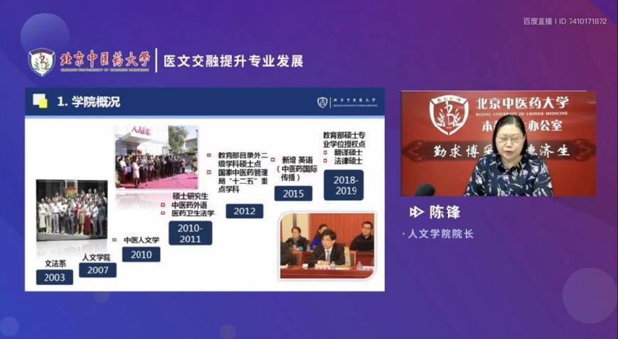 陈锋教授以”医文交融提升专业发展”为主题,从学校概况、学院概况、专业概况等方面对我校人文学院的办学特色及优势进行了精要介绍。