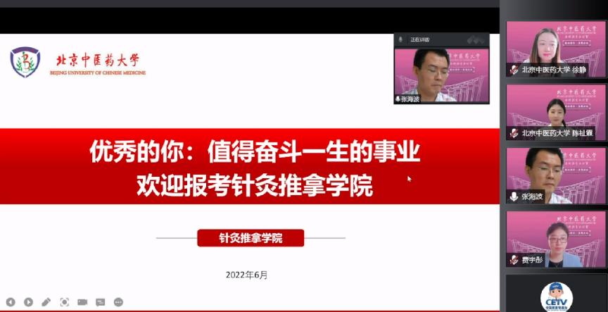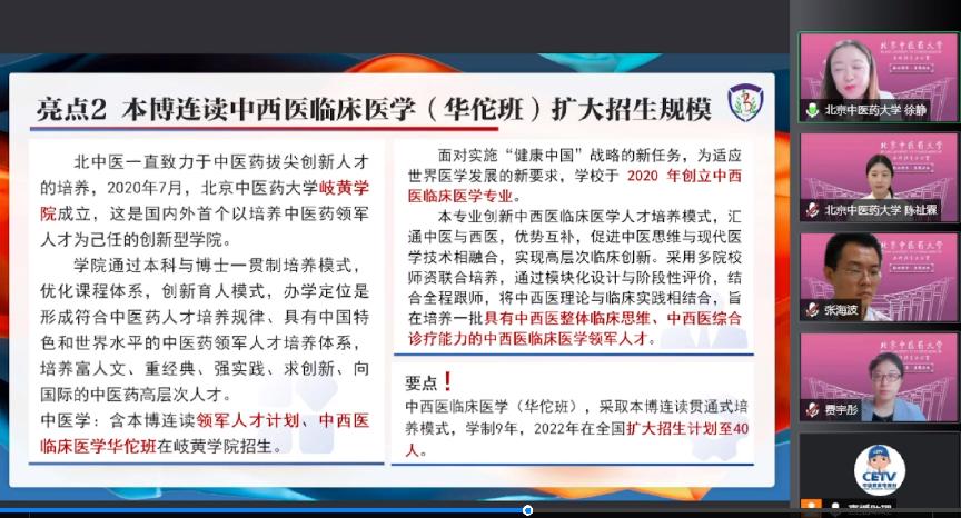 徐老师从我校的基本情况、学校优势及特色专业、录取原则、报考要点及转专业比例四个方面对我校的办学优势及特色进行了详细解读,并对2022年我校新招生专业——中药学(时珍国药班),及岐黄学院的中医学(领军人才计划)和中西医临床医学(华佗班)三个本博连读重量级专业的专业优势、培养特色、就业去向等方面做了细致推介。