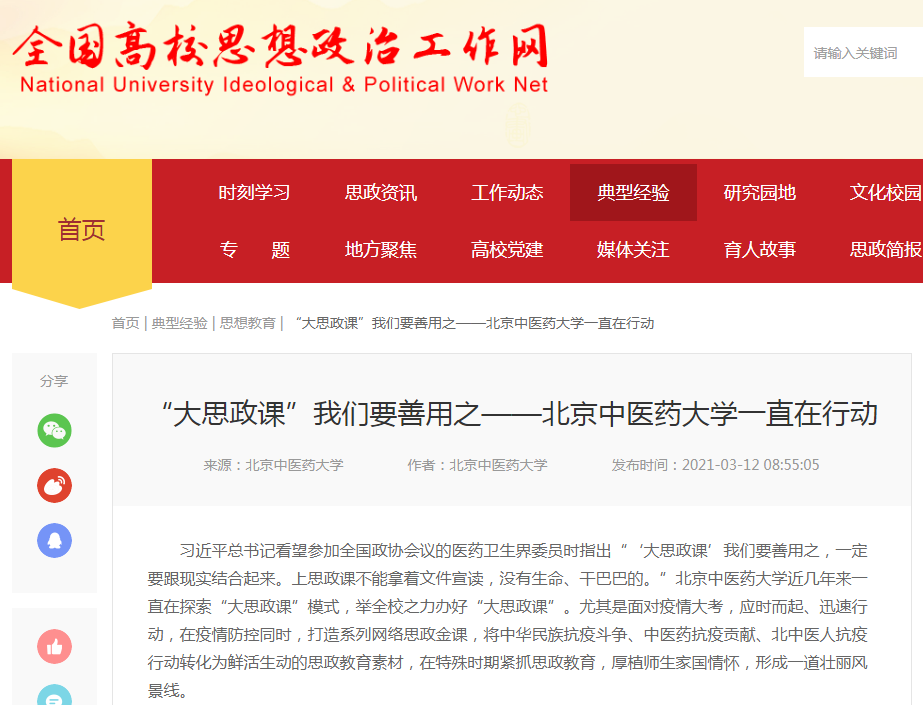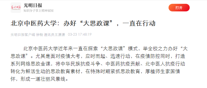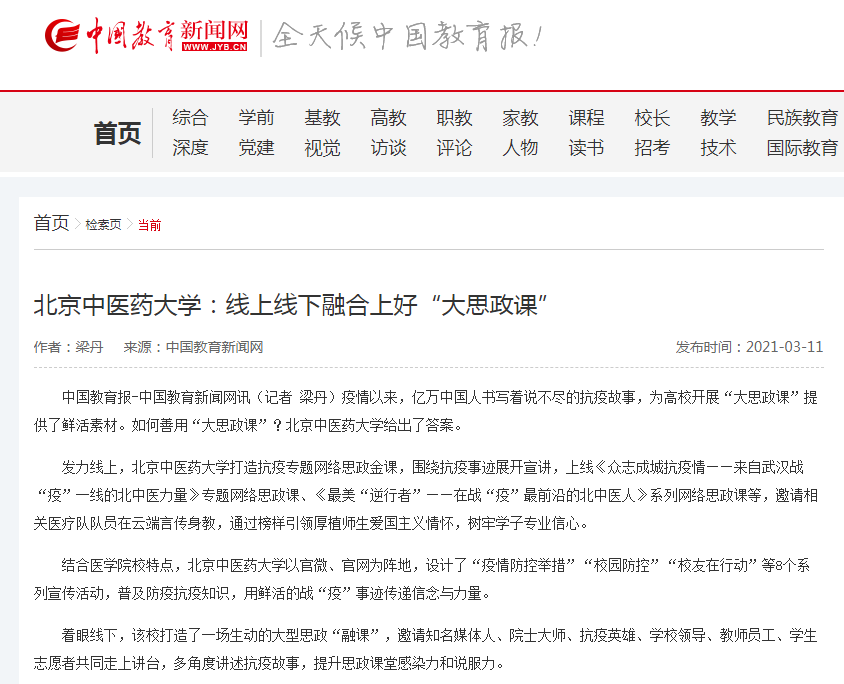 习近平总书记看望参加全国政协会议的医药卫生界委员时指出“‘大思政课’我们要善用之,一定要跟现实结合起来。上思政课不能拿着文件宣读,没有生命、干巴巴的。”yl7703永利集团近几年来一直在探索“大思政课”模式,举全校之力办好“大思政课”。尤其是面对疫情大考,应时而起、迅速行动,在疫情防控同时,打造系列网络思政金课,将中华民族抗疫斗争、中医药抗疫贡献、北中医人抗疫行动转化为鲜活生动的思政教育素材,在特殊时期紧抓思政教育,厚植师生家国情怀,形成一道壮丽风景线。近日,北中医的系列探索与举措被“光明日报”“全国高校思想政治工作网”“中国教育新闻网”等媒体纷纷报道。内容如下: