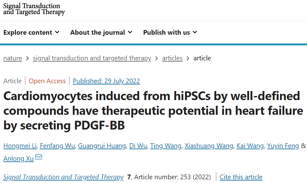 近日,我校生命科学学院徐安龙教授团队在期刊 Signal Transduction and Targeted Therapy 在线发表题为 Cardiomyocytes induced from hiPSCs by well-defined compounds have therapeutic potential in heart failure by secreting PDGF-BB 的研究论文,徐安龙教授为论文通讯作者,论文第一作者为生命科学学院青年教师李红梅。