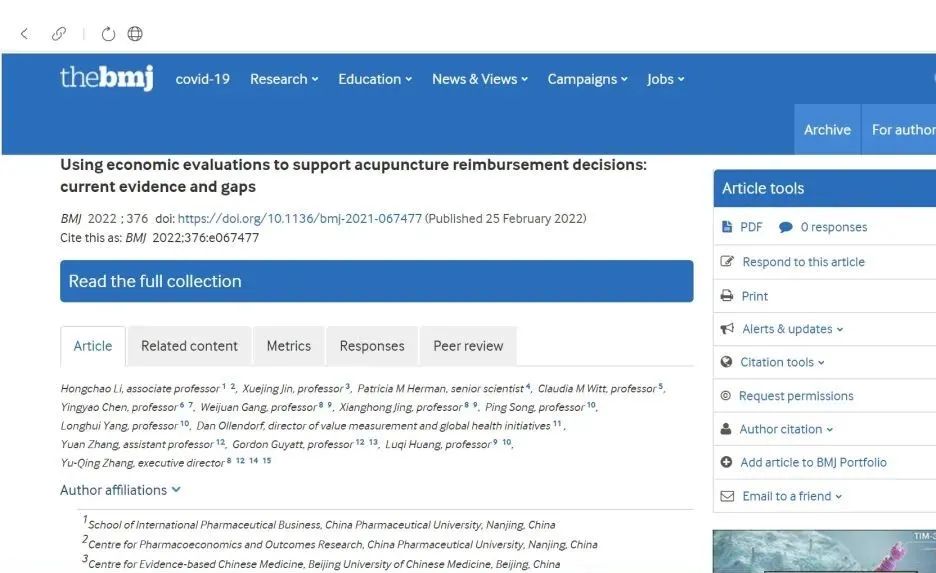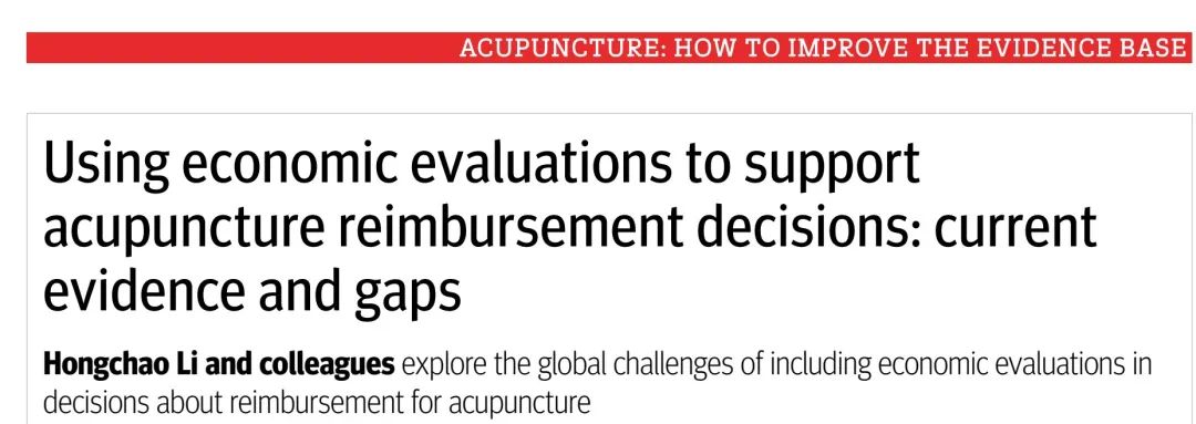 另一篇文章题为《使用卫生经济学评价支持针灸报销决策的现有证据和差距》(Using economic evaluations to support acupuncture reimbursement decisions: current evidence and gaps),由中国药科大学李洪超副教授和yl7703永利集团循证医学中心金雪晶教授作为共同第一作者,汇集了来自中国药科大学、上海复旦大学、中国中医科学院、加拿大麦克马斯特大学、瑞士苏黎世大学、美国塔夫茨医疗中心、RAND公司的相关学者。