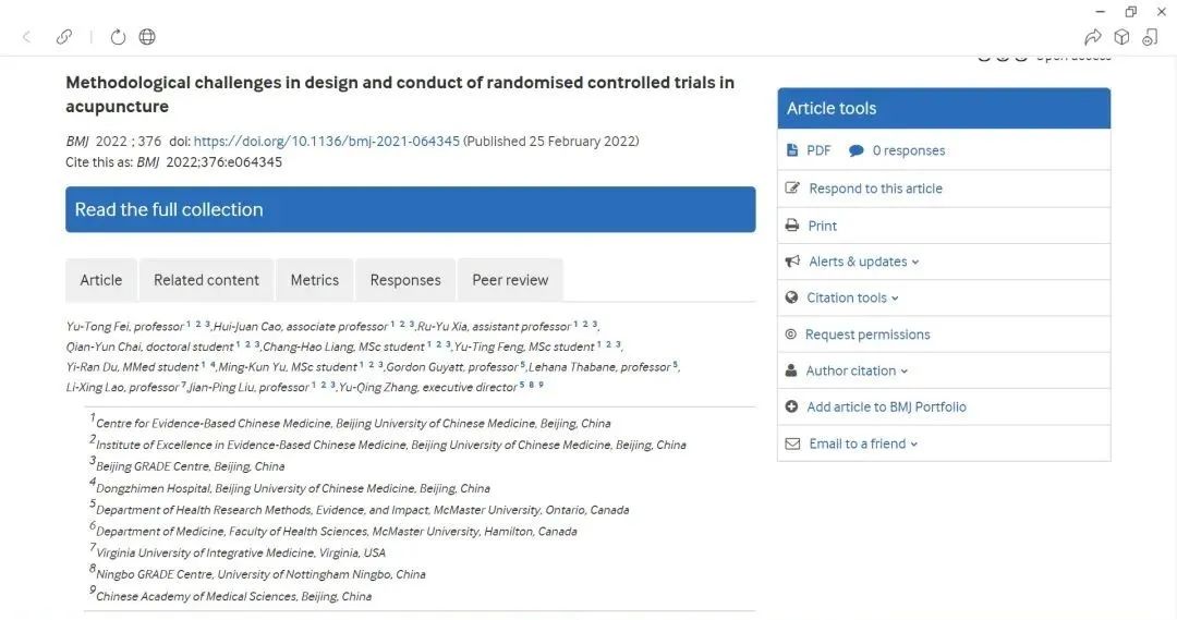第一篇文章题为《针刺随机对照试验设计和实施中的方法学挑战》(Methodological challenges in design and conduct of randomised controlled trials in acupuncture),由循证医学中心刘建平教授(通讯作者)和费宇彤研究员(第一作者)领衔,曹卉娟副教授(共同第一作者)、夏如玉博士作为主要作者,带领柴倩云等研究生共同完成,汇集加拿大麦克马斯特大学、美国弗吉尼亚中医药大学等著名循证医学专家和针灸专家,在查阅参考了大量国内外针灸临床研究文献的基础上,结合多年来在针灸临床研究当中的经验,以及在针灸标准化研究过程当中的挑战,经过多轮反复论证和共识之后形成。