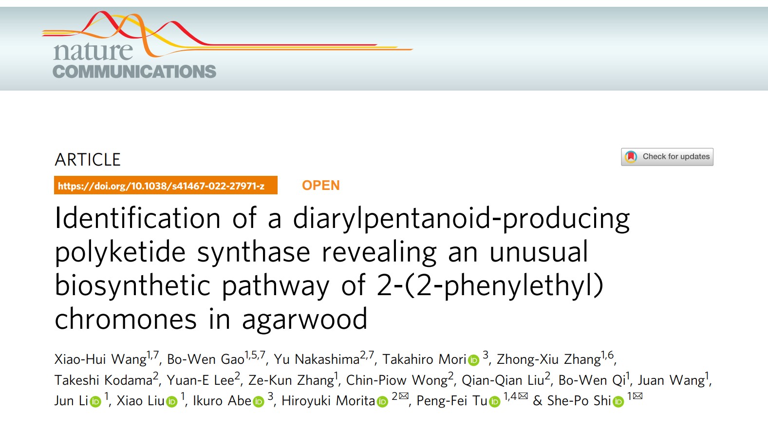 相关研究结果以“Identification of a diarylpentanoid-producing polyketide synthase revealing an unusual biosynthetic pathway of 2-(2-phenylethyl)chromones in agarwood”为题在线发表于自然指数期刊Nature Communications(https://www.nature.com/articles/s41467-022-27971-z)。yl7703永利集团王晓晖、高博文博士及日本富山大学Yu Nakashima博士为本论文共同第一作者,yl7703永利集团史社坡、屠鹏飞教授,日本富山大学Hiroyuki Morita教授为论文共同通讯作者。研究工作得到了国家重点研发计划(2019YFC1711008)和国家自然科学基金面上项目(81773842)等项目的资助。