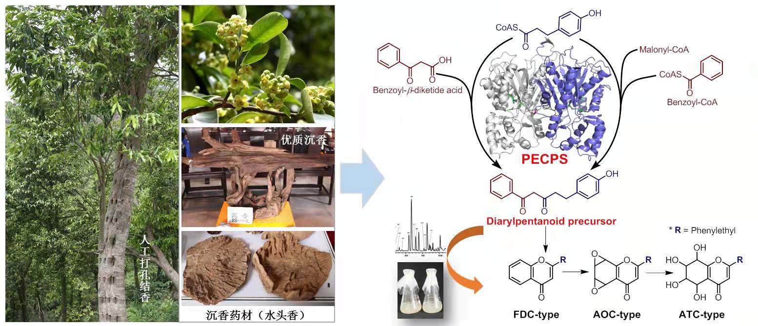 沉香的形成实质上是防御性次生代谢产物苯乙基色酮类和倍半萜类成分在体内缓慢合成累积的过程。其中苯乙基色酮类成分是沉香的特有成分,也是其功效和独特香味的主要物质。我校中药现代研究中心团队与日本富山大学、东京大学学者合作,破解了苯乙基色酮的生物合成机制,构建了利用白木香悬浮细胞快速合成结构多样的苯乙基色酮的生物合成体系;克隆鉴定了合成苯乙基色酮的关键酶PECPS, 通过将PECPS在本氏烟中瞬时表达、在白木香愈伤组织中敲低表达等实验,证明PECPS的体内生物学功能;制备并解析了PECPS及其4个关键突变体蛋白的晶体结构,阐明了PECPS独特的催化机制。研究结果突破了利用合成生物学手段组合合成沉香苯乙基色酮类成分和精准调控白木香结香的关键科学问题。